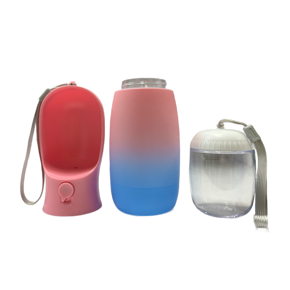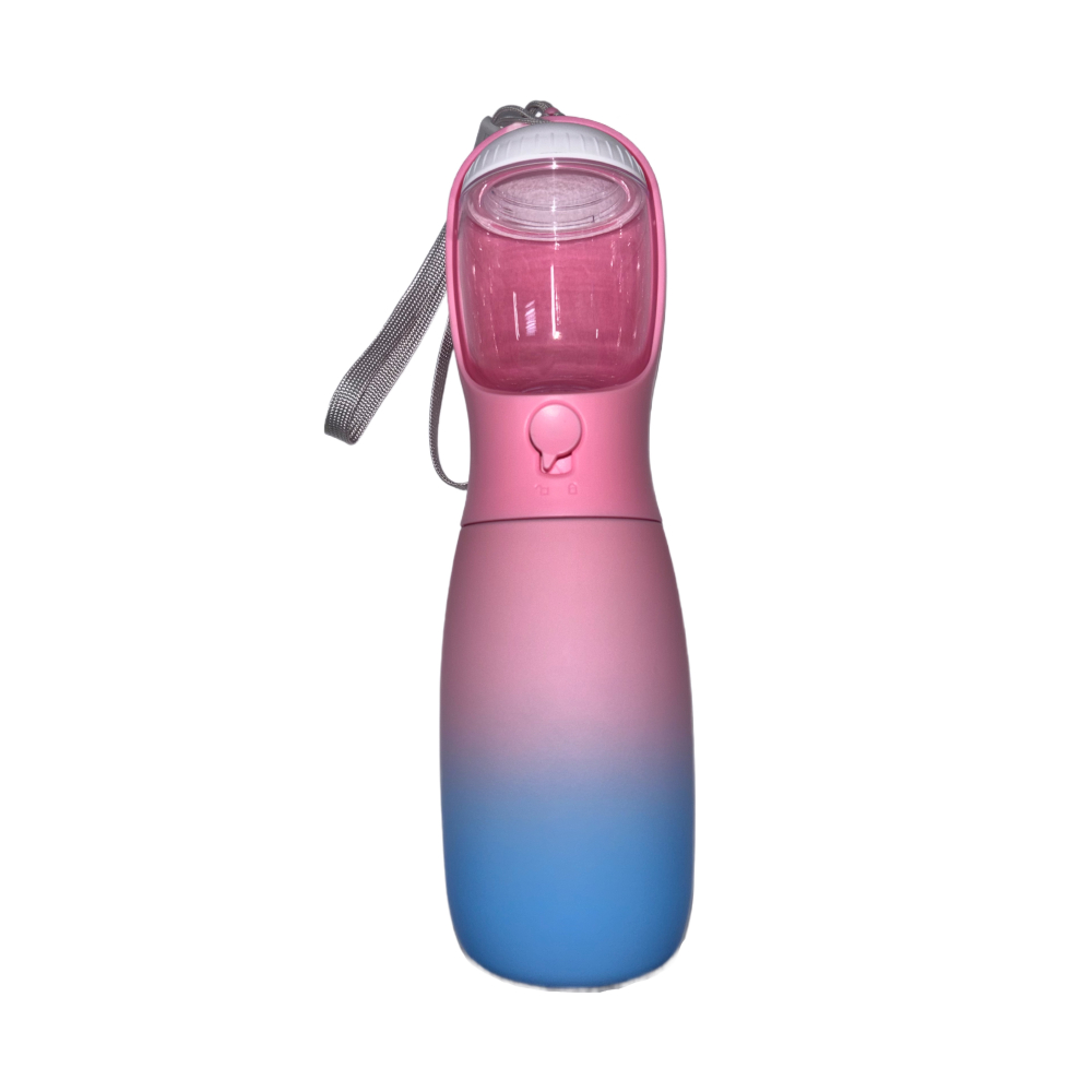 Дорожня пляшка для тварин 2 в 1 для їжі та води з градієнтним кольором. Складається з відділення 100 мл для води і відділення 550 мл для сухого корму.