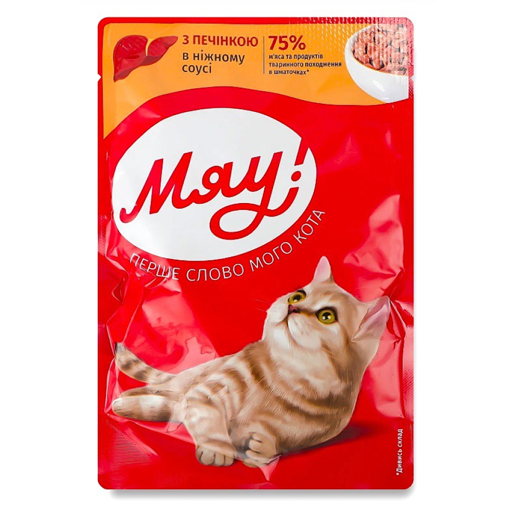 корм для котів Мяу печінка в соусі 85 г - це збалансований раціон для дорослих кішок, в основі