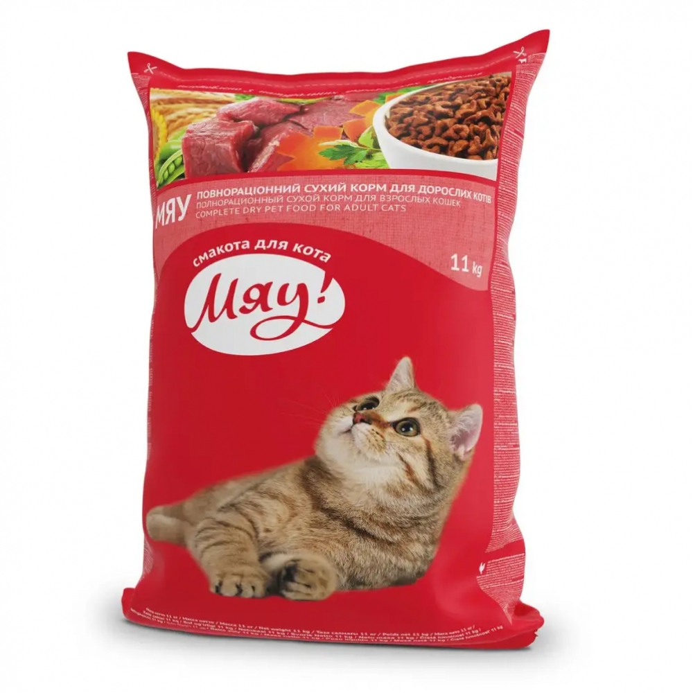 Корм економ-класу Мяу! - збалансоване харчування для дорослих кішок, яке забезпечує організм тварини всіма необхідними поживними речовинами: білками, жирами, вуглеводами, вітамінами і мінералами, які є необхідними для повноцінного життя кішки. Оптимальний вміст і співвідношення кальцію, фосфору і магнію забезпечує профілактику сечокам'яного захворювання.
